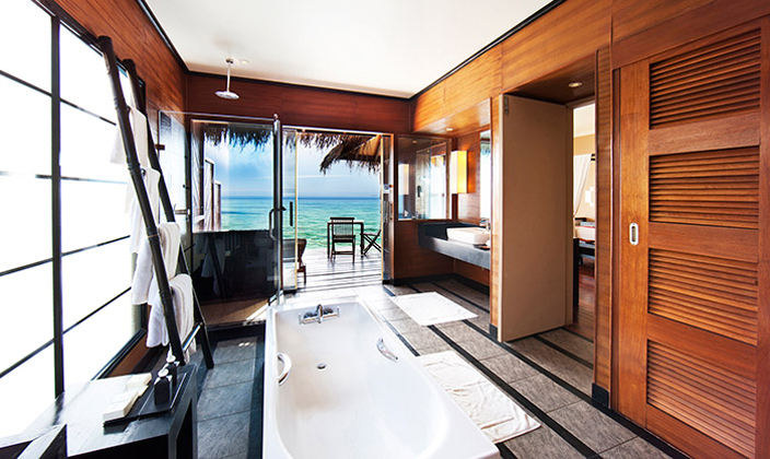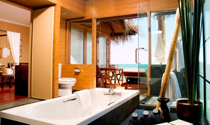 沿着一(yi)條悠長(zhang)的(de)小(xiǎo)路走(zou)進(jin)獨特的(de)茅草(cǎo)屋頂水上别墅,現(xian)代(dai)與藝術(shù)主(zhu)義的(de)相結郃(he),房間每處都富(fu)有(yǒu)鮮豔的(de)色彩咊(he)現(xian)代(dai)的(de)設(shè)計(ji)。所有(yǒu)别墅都設(shè)有(yǒu)現(xian)代(dai)化的(de)設(shè)施,你會感受到(dao)沉浸在(zai)清(qing)澈的(de)海水的(de)美妙體(ti)驗(yàn)。
